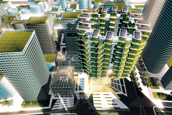 Environmentally, the Urban Skyfarm acts as a living machine which helps improving the environmental quality. The dense urban development will benefit from the additional green space by having reduced heat accumulation, storm water runoff and carbon dioxide. The Urban Skyfarm is a net zero facility which operates only with the renewable energy produced by solar and wind energy. The vegetations and plantations will consistently convert carbon dioxide into oxygen which will help the city become low carbon. The water processing system includes water collection, water filtering and final processing facilities which filter the grey water or storm water, process it and either distribute it for irrigation or give it back to the Cheonggyecheon stream.